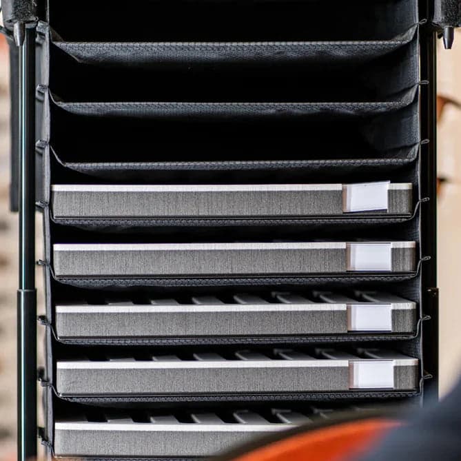 Whether in field service, at trade fairs or in the showroom – the pull-up sample case transforms in seconds into a clear folding shelf with integrated trays and provides immediate access to your products.