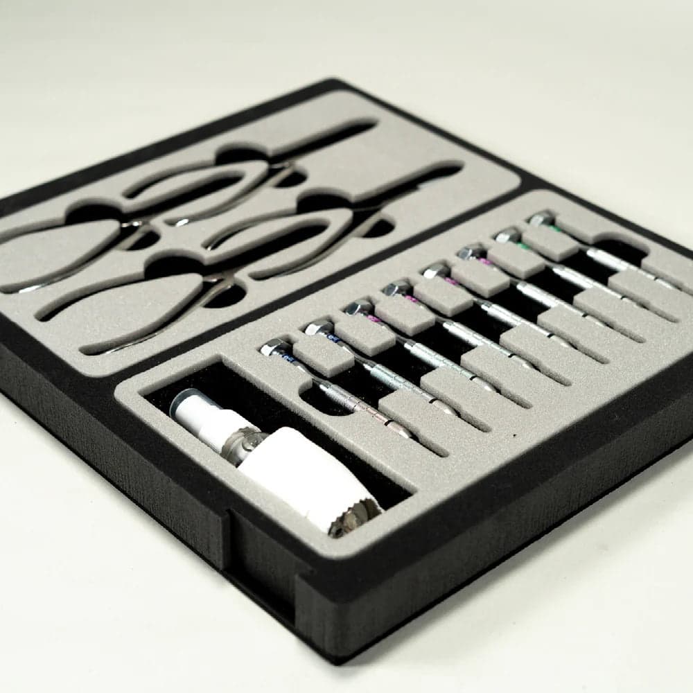 This is what your perfectly customized tray could look like: precisely cut with state-of-the-art water jet technology, dimensionally stable, high-quality, and tailor-made for your products. Whether delicate individual parts, sensitive instruments, or entire sets – with the water-cut foam inlay, everything fits to the millimeter.
